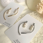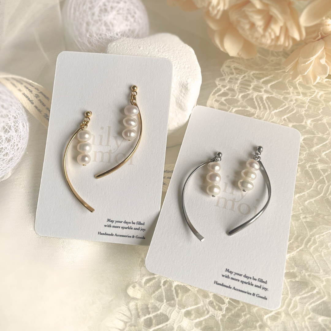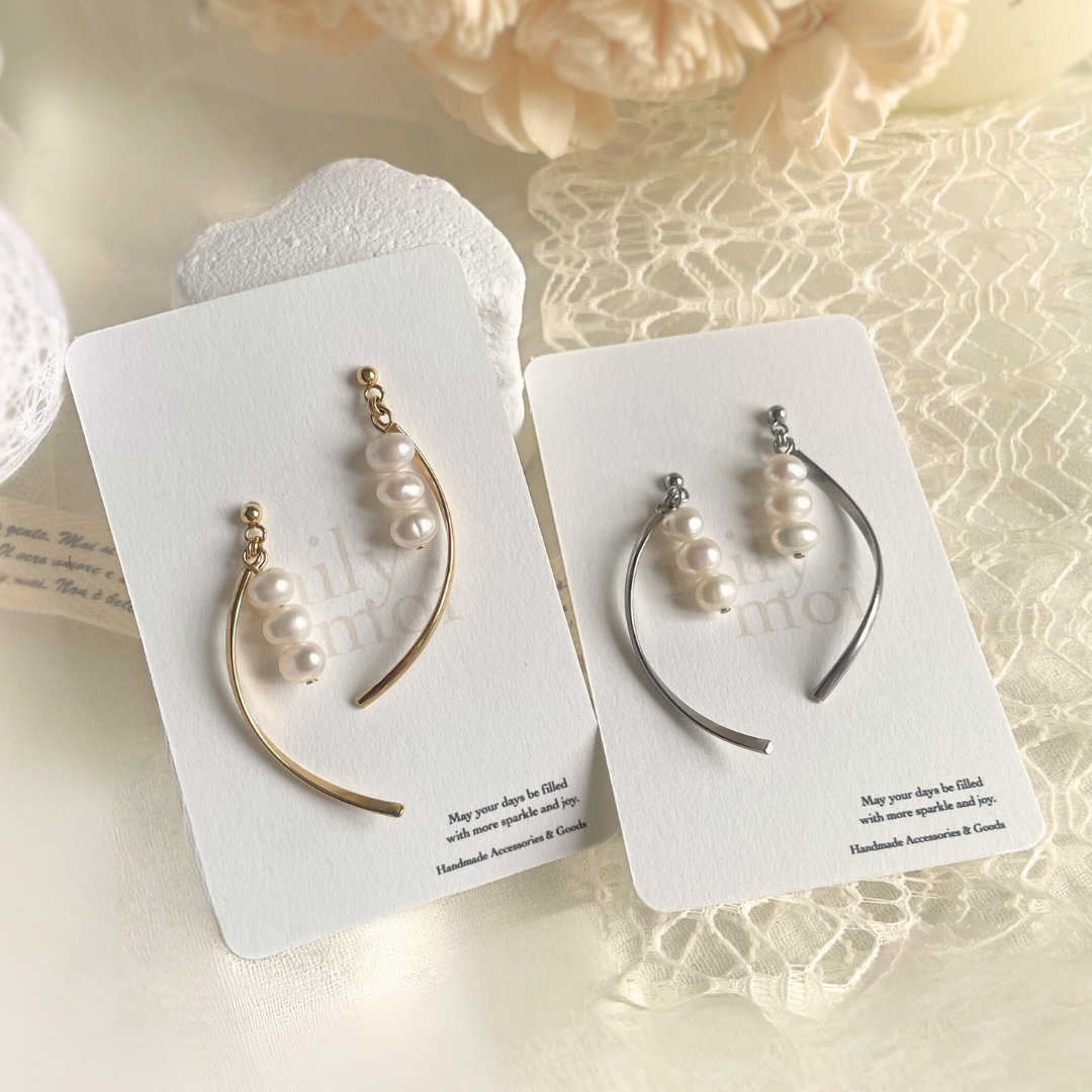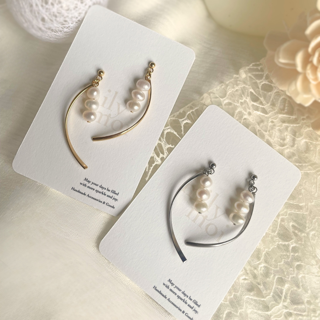三粒の淡水パールと、耳元でアーチを描く繊細なラインのEclat Arch ピアス。 天然素材特有のしっとりとした艶が、肌に溶け込むように馴染み、洗練された品格を宿します。 仕草に合わせて生まれるしなやかな揺れが、横顔に美しい陰影を演出。 日常の装いにはもちろん、結婚式などのオケージョンシーンにもおすすめです。